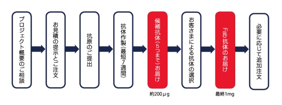 1から5つまでの候補抗体(各200μg)のご提供とその中からお客様に選んでいただいた最終抗体を1mg(Myc-Hisタグ付、ELISA陽性)ご提供
