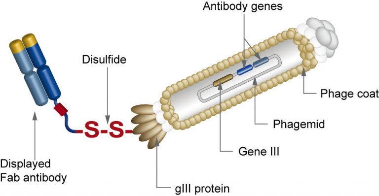 450億種類の抗体遺伝子(ライブラリ)と、これらの抗体を提示したファージと抗原を結合させ、抗原と結合したファージを効率よく回収する技術(ファージディスプレイ)が融合したオリジナルの技術です。